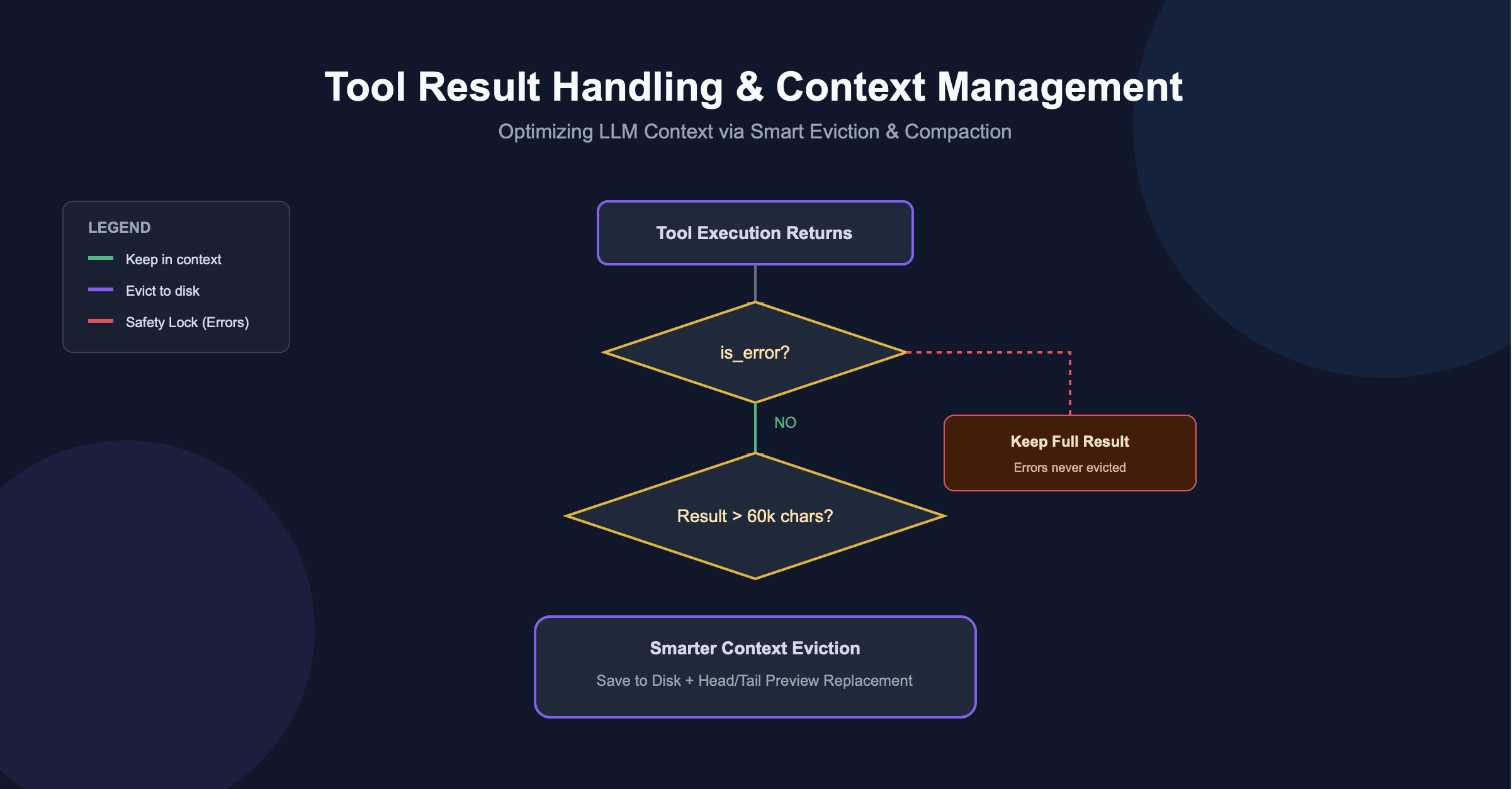 A single successful tool call that returns far more than the next model invocation needs is a pressure point for the agent. A full SQL dump, a verbose schema inspection, or a giant traceback can silently bloat the conversation until the next call fails with a token error. That is what led us to build large-result eviction directly into the loop.