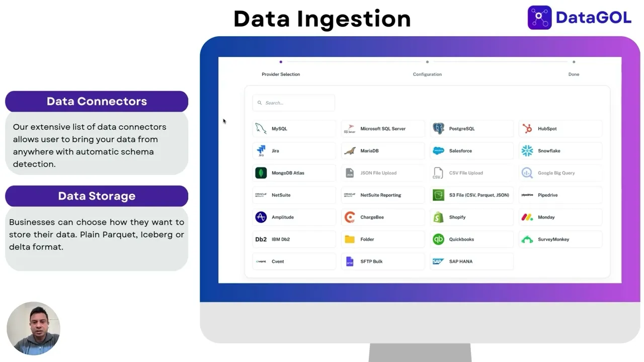 DataGOL utilizes Airbyte, an open-source data integration platform with over 500 pre-built connectors, to ingest data from a wide range of sources. For legacy systems or those with custom APIs lacking existing connectors, DataGOL leverages its GenAI capabilities to rapidly develop custom connectors, often within a day or two. This allows for the consolidation of data from all the customer's relevant systems into their data warehouse.
