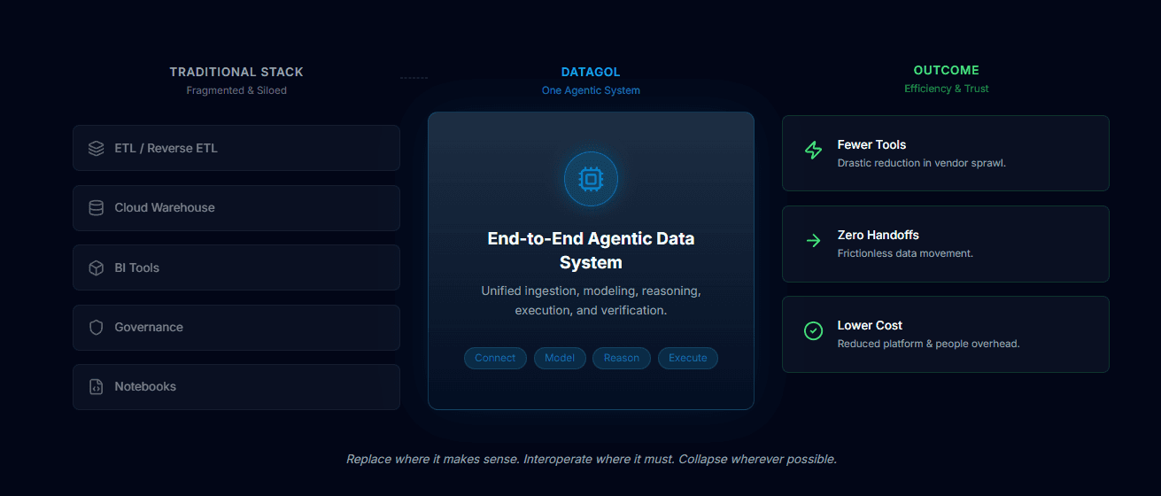 By replacing fragmented tools and manual coordination with a single agentic system, organizations reduce both platform spend and the hidden cost of human glue.